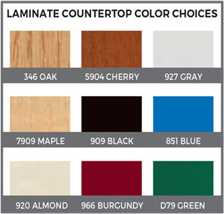 • Countertop Colors (square-edged top or high pressure laminates with matching PVC edging):
